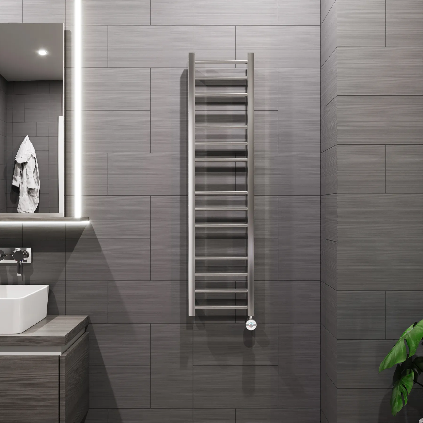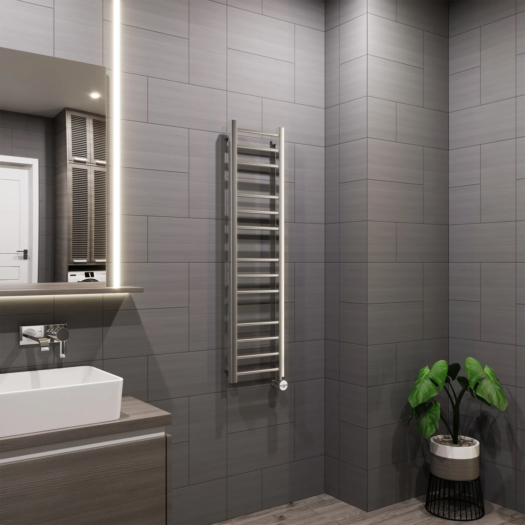 Универсальное подключение к сети дают возможность подключения полотенцесушителя и слева и справа. Скрытое подключение обеспечивает эстетичный внешний вид при котором нет видимых проводов. В комплекте так же есть кабель-вилка длиной 100 см для обычного подключения через розетку.