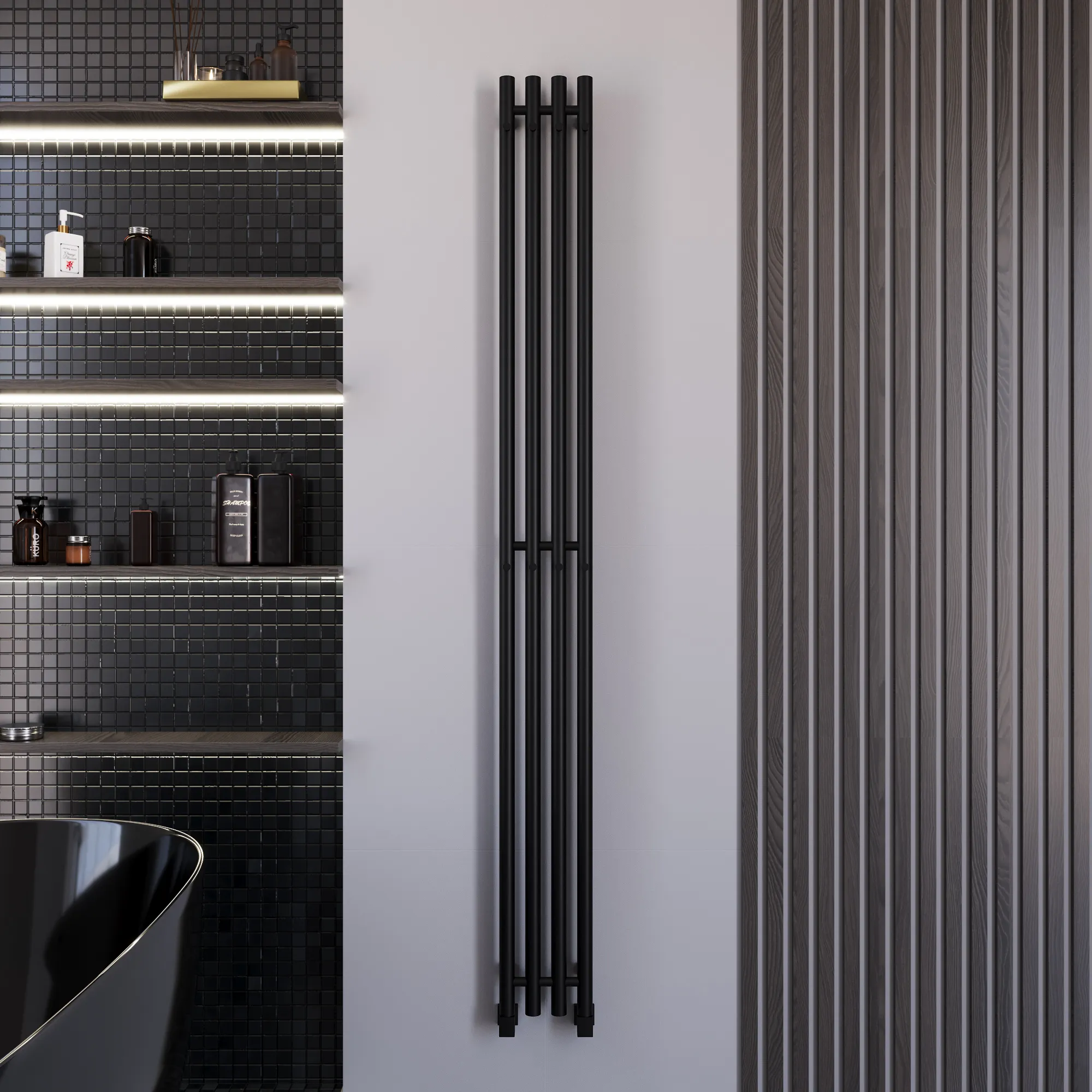 Универсальное подключение к сети дают возможность подключения полотенцесушителя и слева и справа. Скрытое подключение обеспечивает эстетичный внешний вид при котором нет видимых проводов. В комплекте так же есть кабель-вилка длиной 100 см для обычного подключения через розетку.
