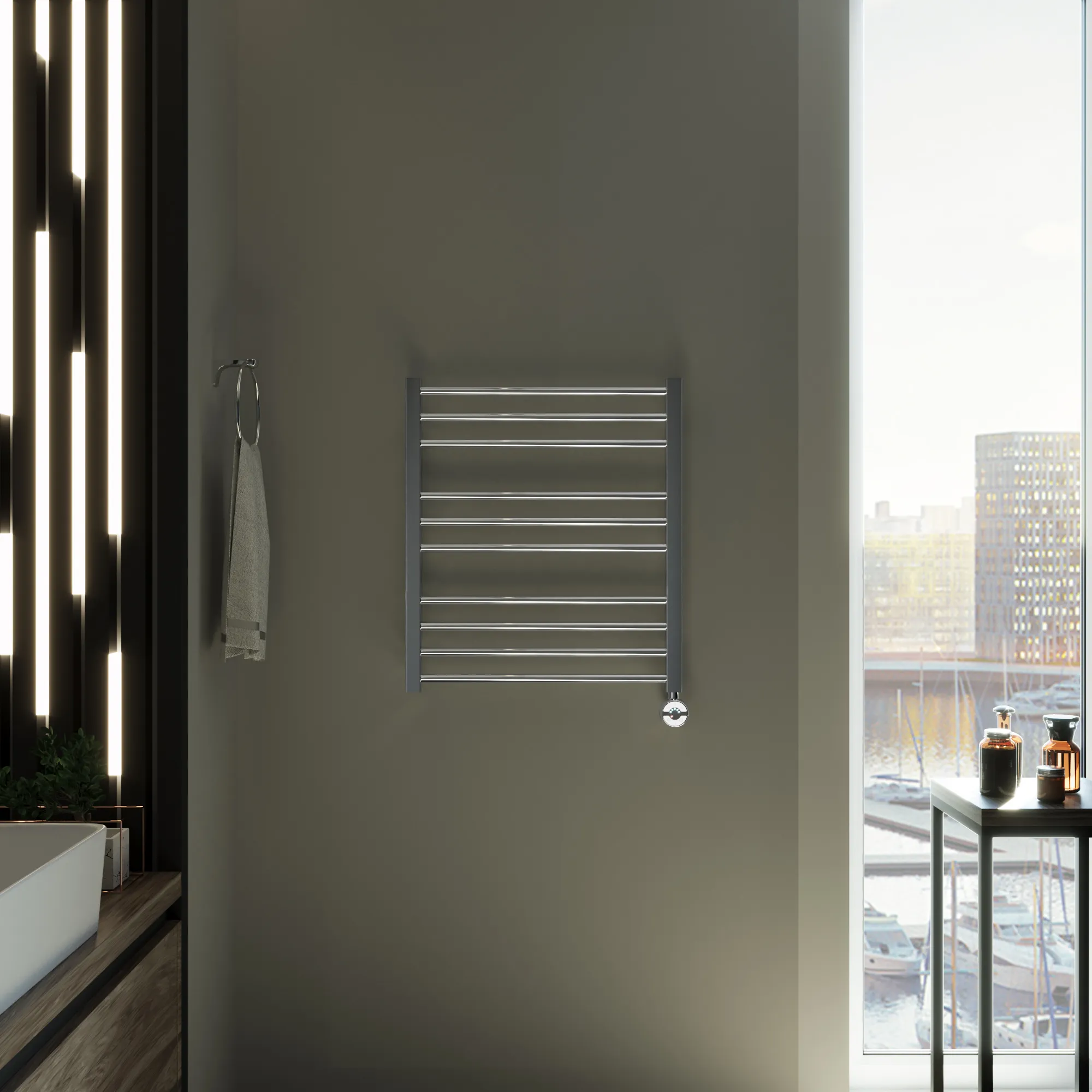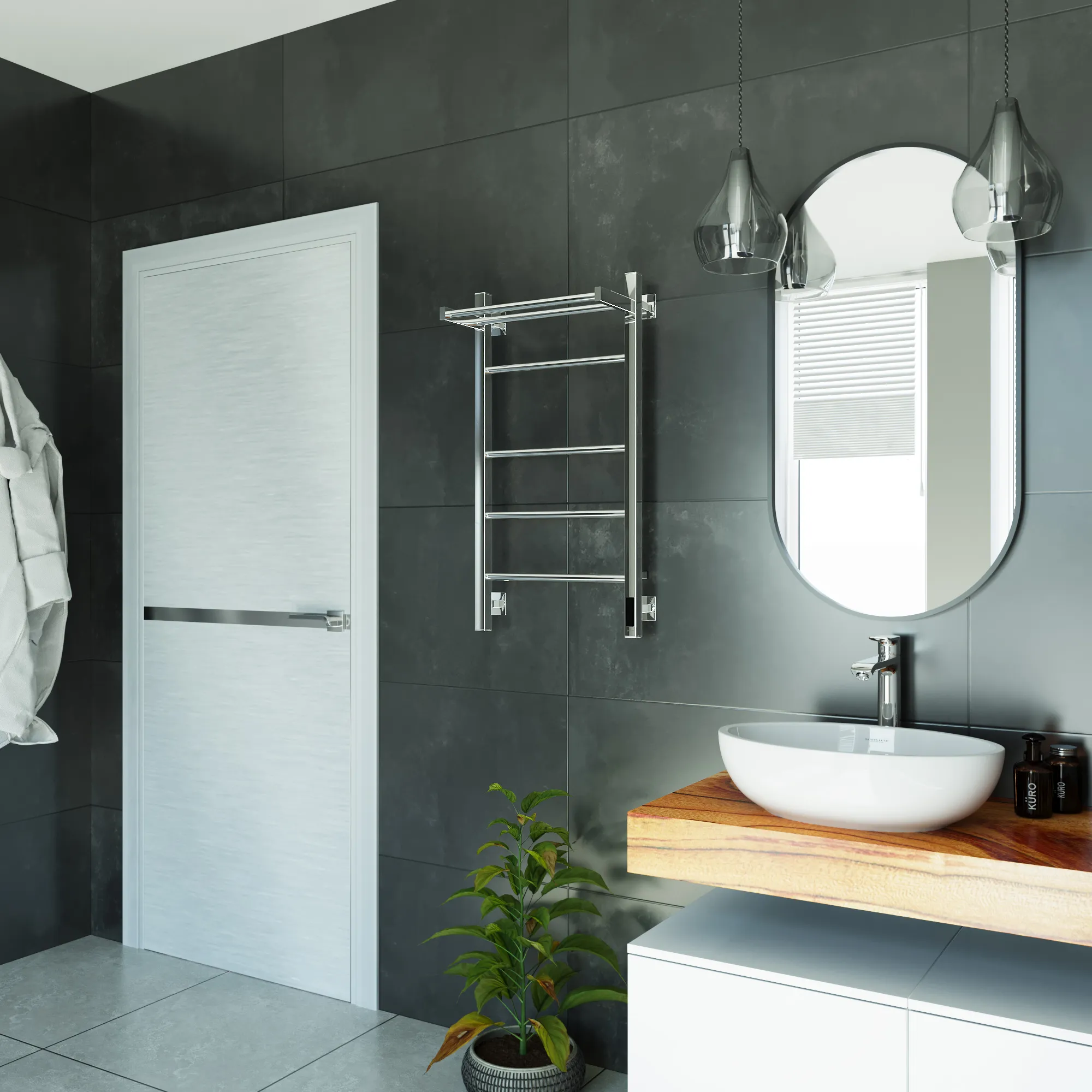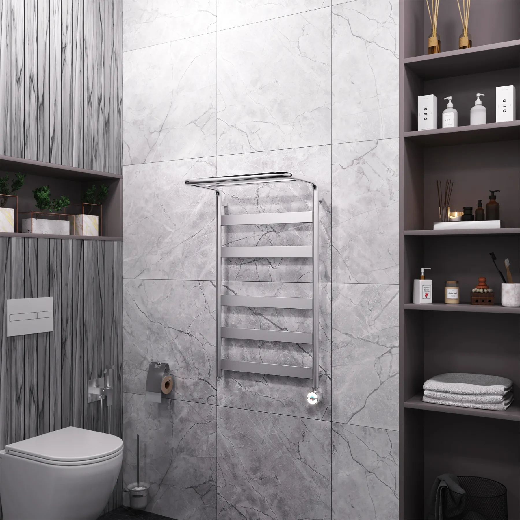 Универсальное подключение к сети дают возможность подключения полотенцесушителя и слева и справа. Скрытое подключение обеспечивает эстетичный внешний вид при котором нет видимых проводов. В комплекте так же есть кабель-вилка длиной 100 см для обычного подключения через розетку.