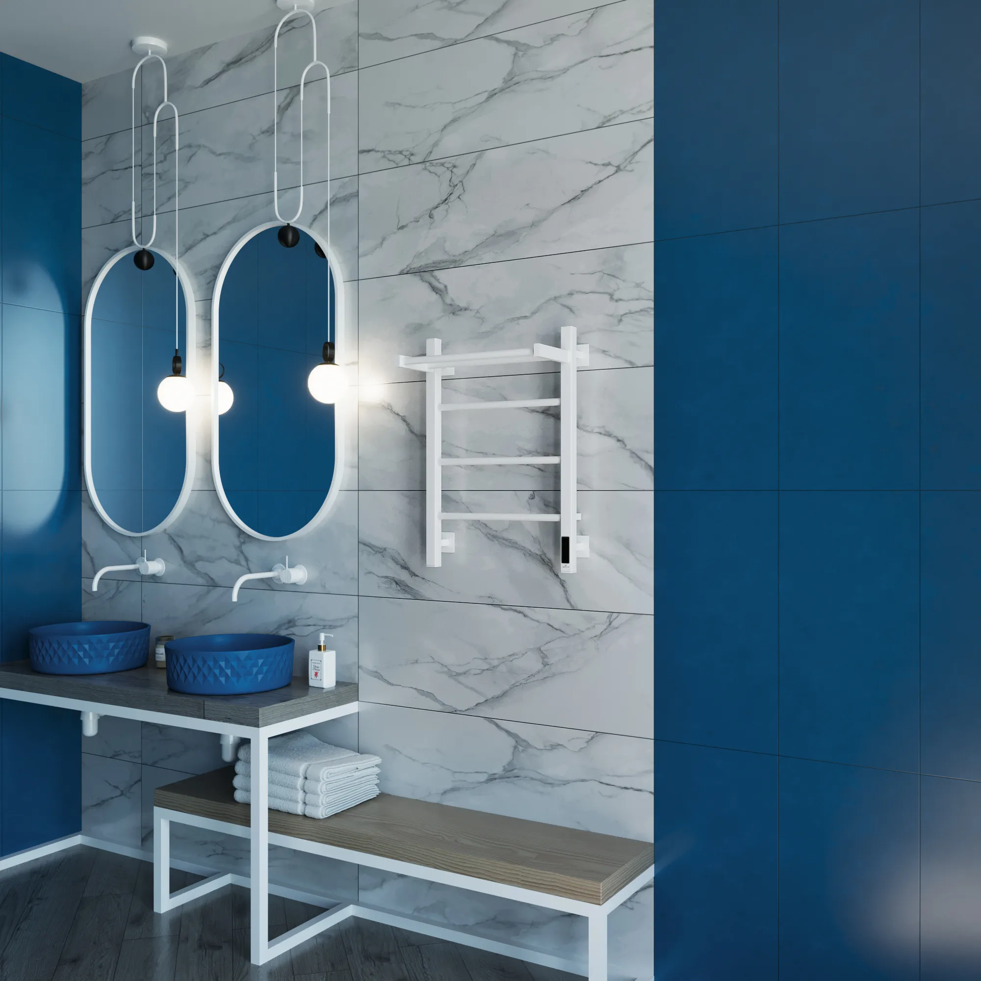 Полотенцесушитель электрический, комплект дюбелей, винтов, шайб, болтов с шестигранной головкой, шестигранный ключ, модуль скрытого подключения, съемный кабель-вилка, гарантийный талон, технический паспорт.