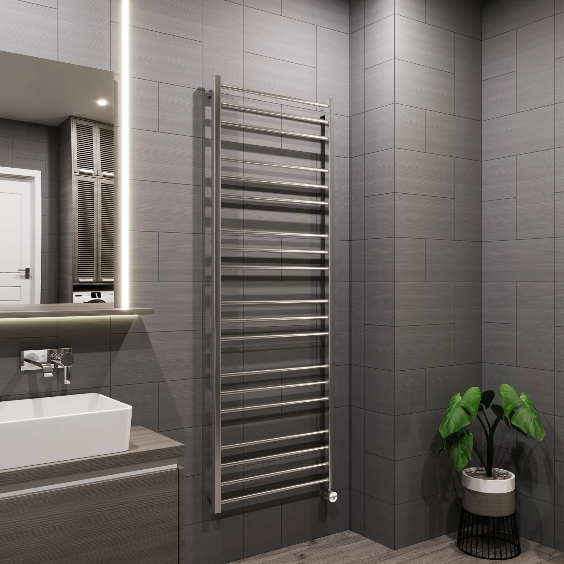 Универсальное подключение к сети дают возможность подключения полотенцесушителя и слева и справа. Скрытое подключение обеспечивает эстетичный внешний вид при котором нет видимых проводов. В комплекте так же есть кабель-вилка длиной 100 см для обычного подключения через розетку.