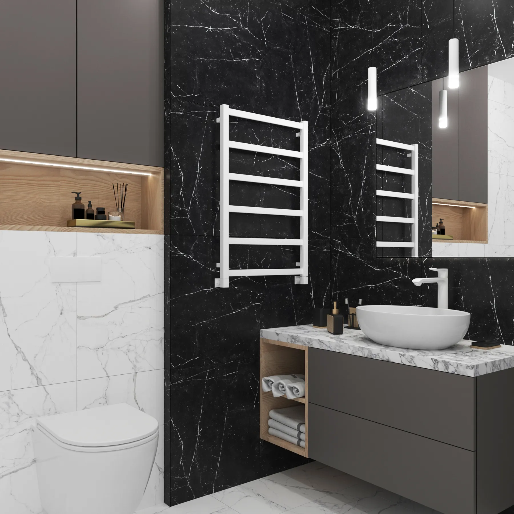 полотенцесушитель, перчатки, комплект дюбелей, винтов, шайб, болтов с шестигранной головкой, шестигранный ключ, кран Маевского, инструкция по монтажу