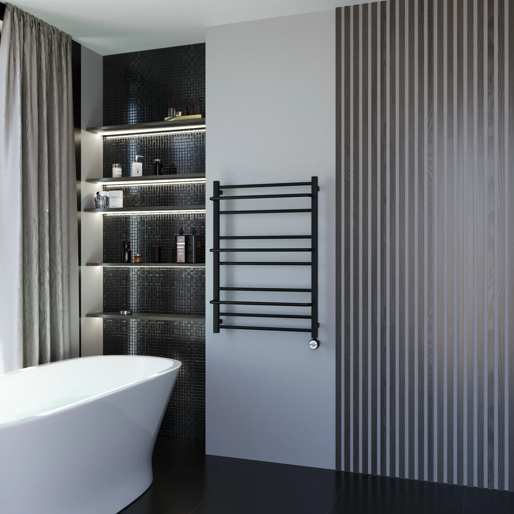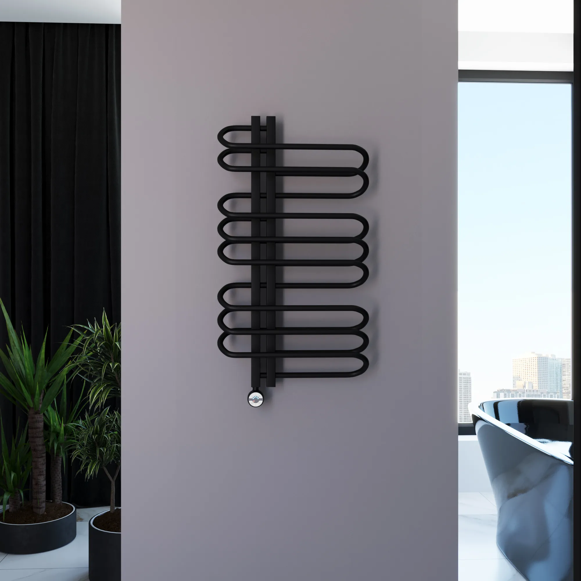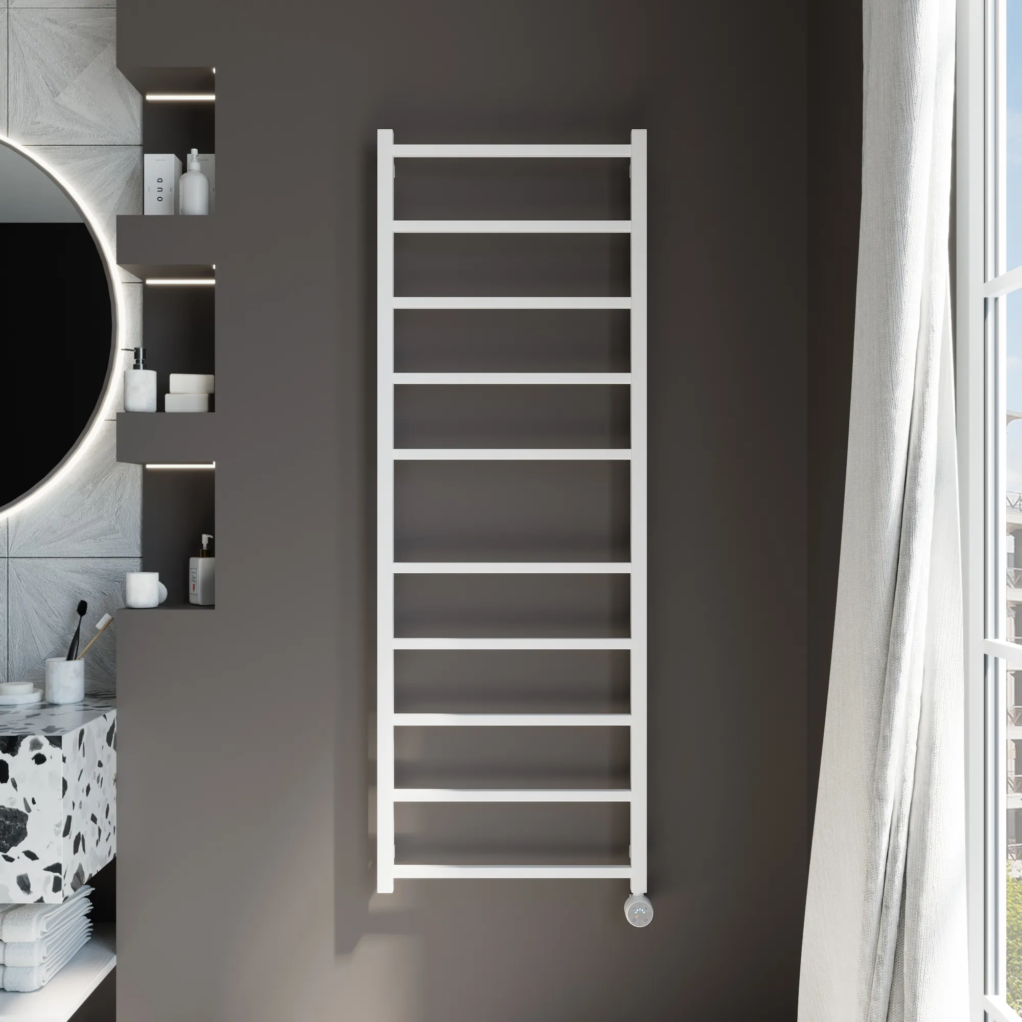 Универсальное подключение к сети дают возможность подключения полотенцесушителя и слева и справа. Скрытое подключение обеспечивает эстетичный внешний вид при котором нет видимых проводов. В комплекте так же есть кабель-вилка длиной 100 см для обычного подключения через розетку.
