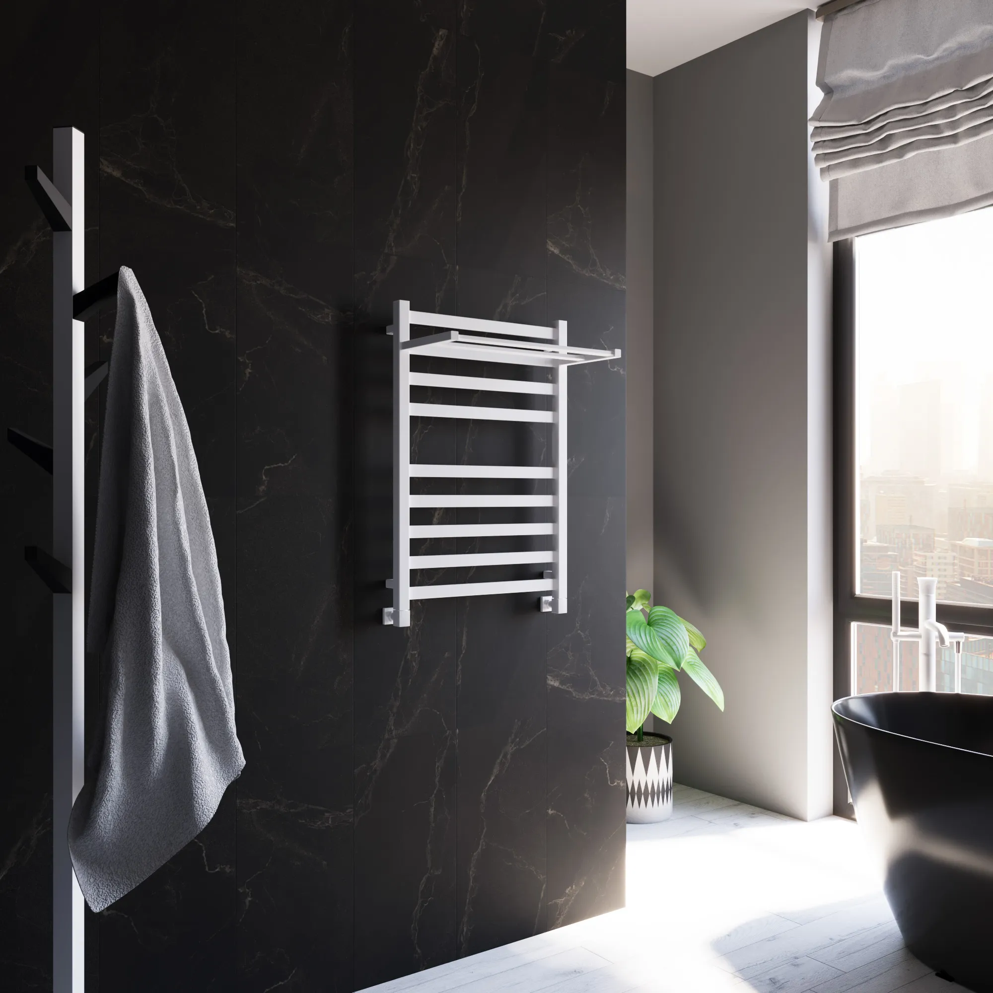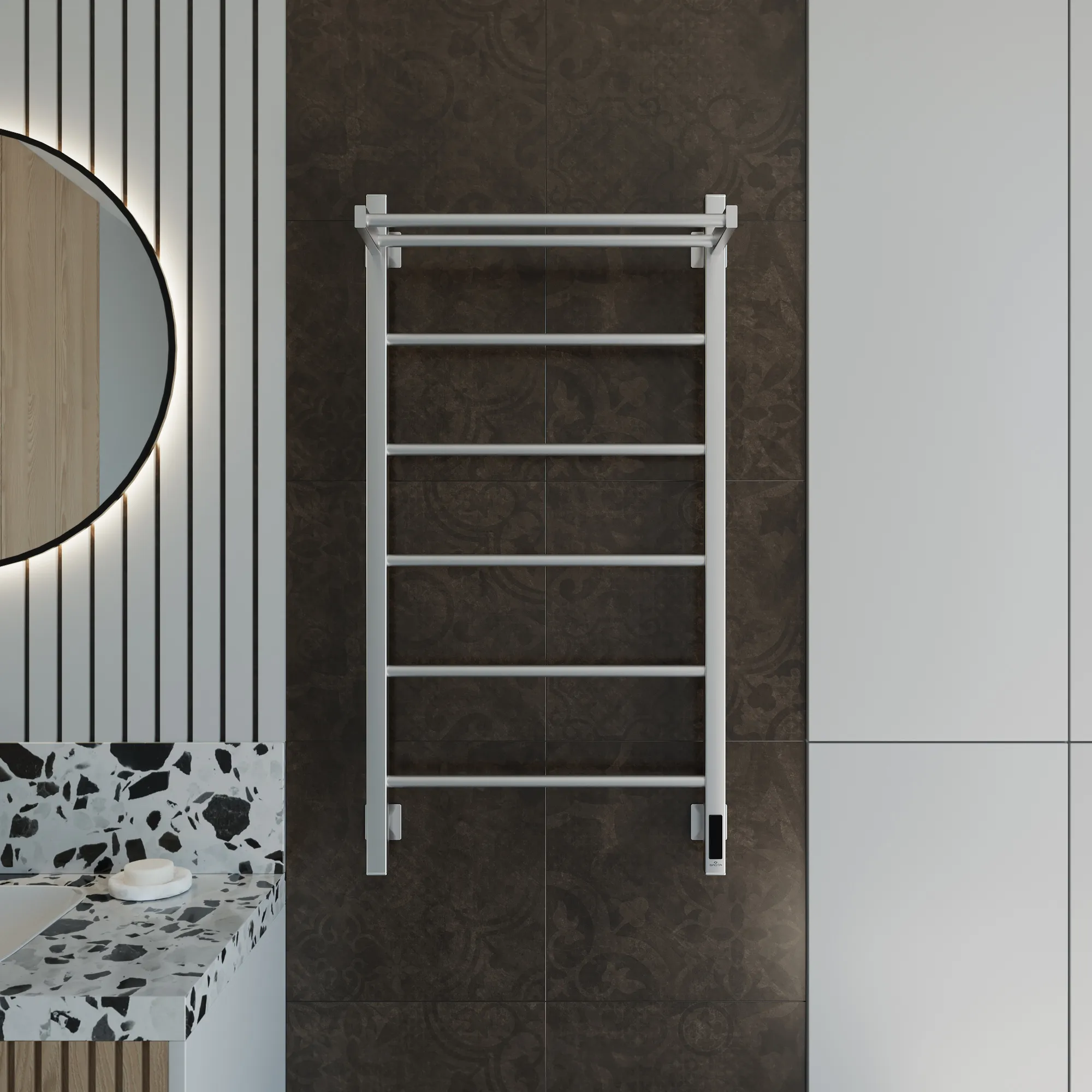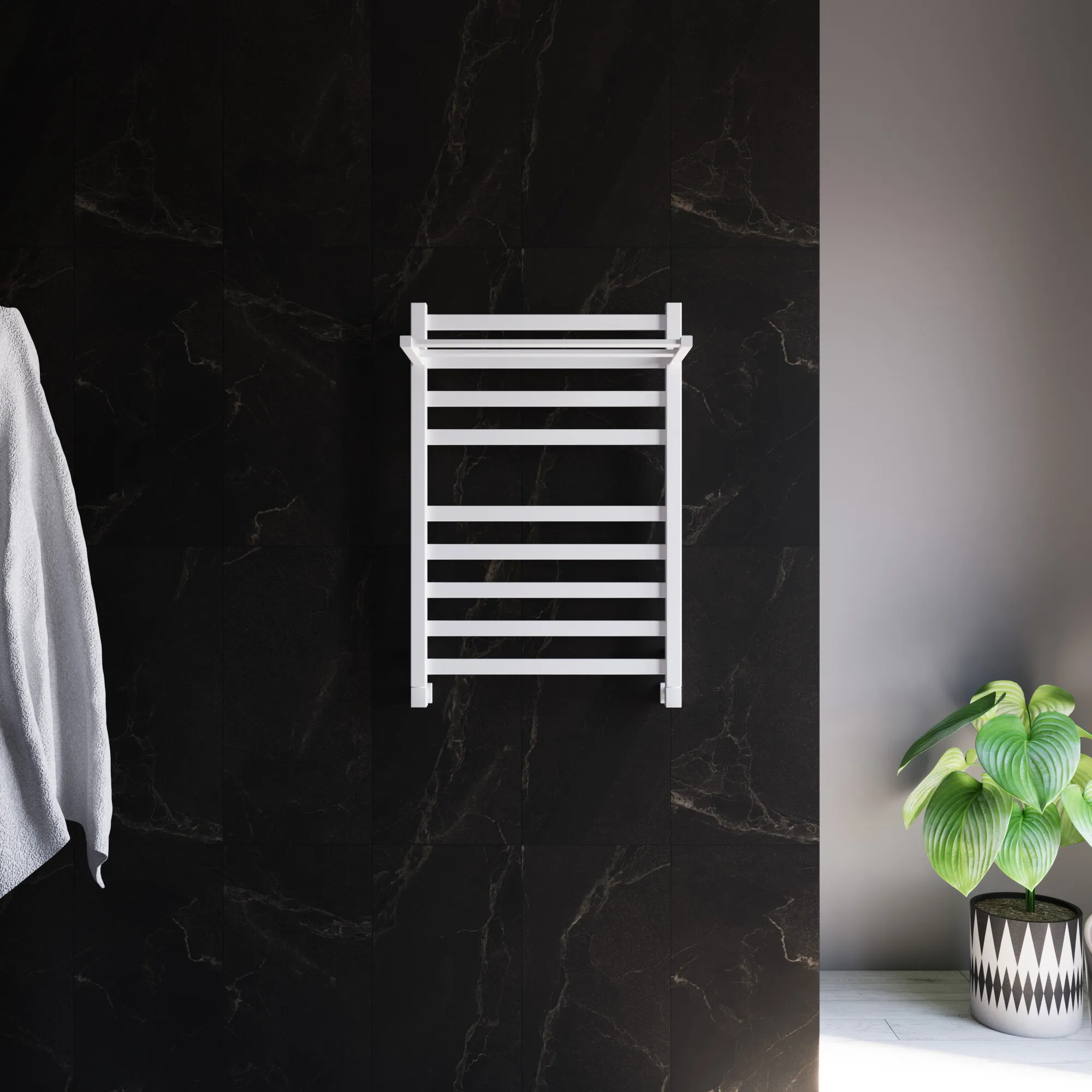Универсальное подключение к сети дают возможность подключения полотенцесушителя и слева и справа. Скрытое подключение обеспечивает эстетичный внешний вид при котором нет видимых проводов. В комплекте так же есть кабель-вилка длиной 100 см для обычного подключения через розетку.
