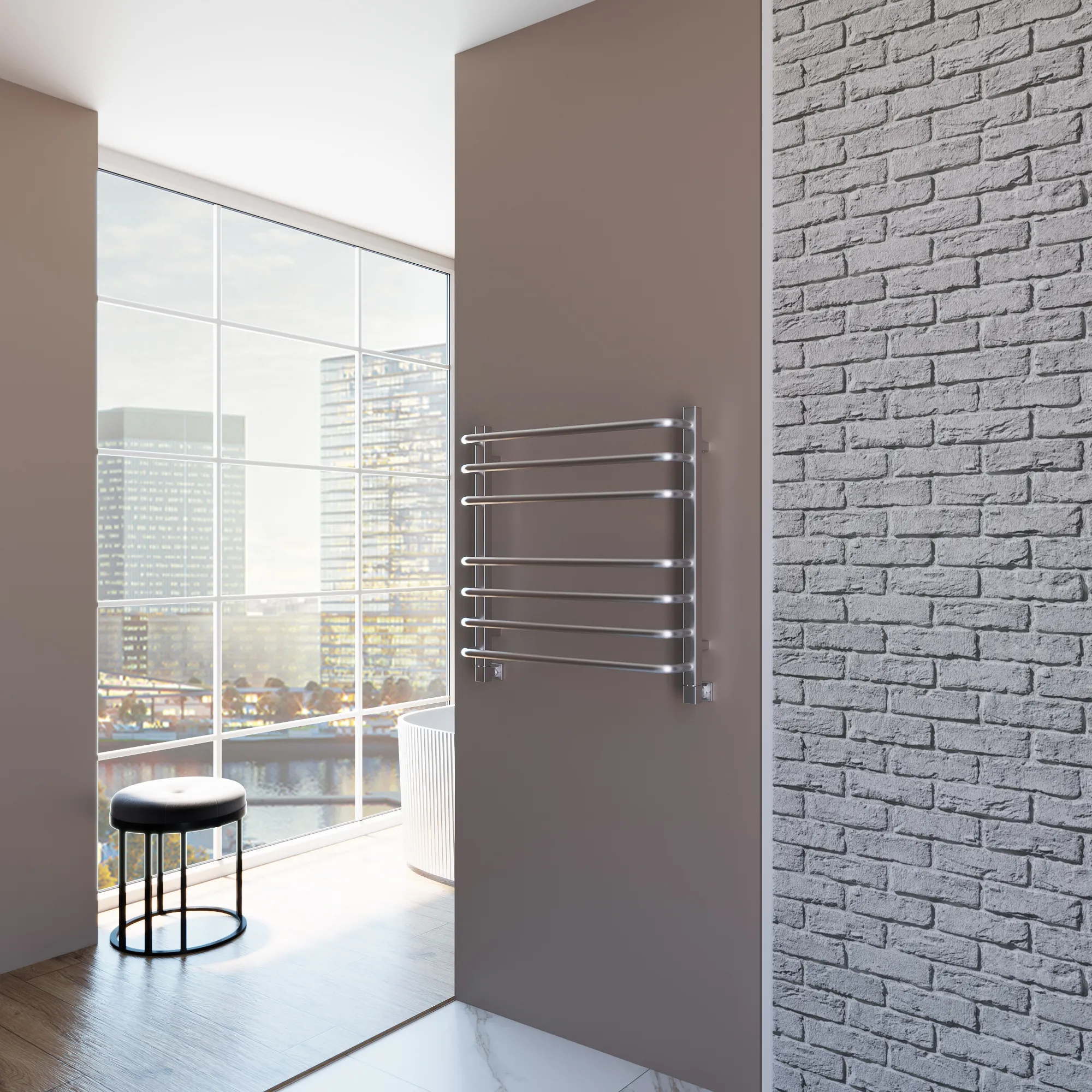 Универсальное подключение к сети дают возможность подключения полотенцесушителя и слева и справа. Скрытое подключение обеспечивает эстетичный внешний вид при котором нет видимых проводов. В комплекте так же есть кабель-вилка длиной 100 см для обычного подключения через розетку.