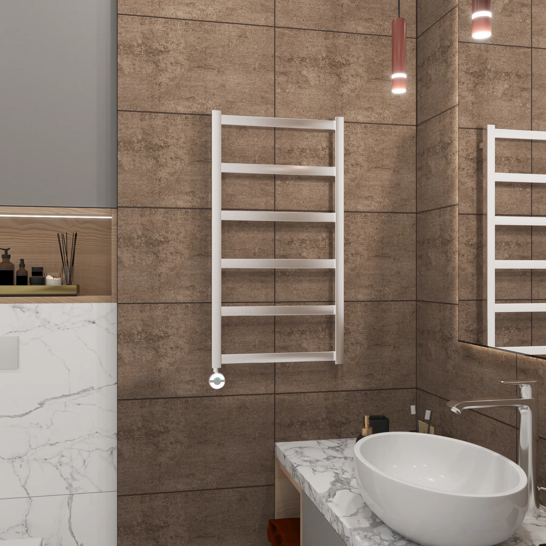 Универсальное подключение к сети дают возможность подключения полотенцесушителя и слева и справа. Скрытое подключение обеспечивает эстетичный внешний вид при котором нет видимых проводов. В комплекте так же есть кабель-вилка длиной 100 см для обычного подключения через розетку.