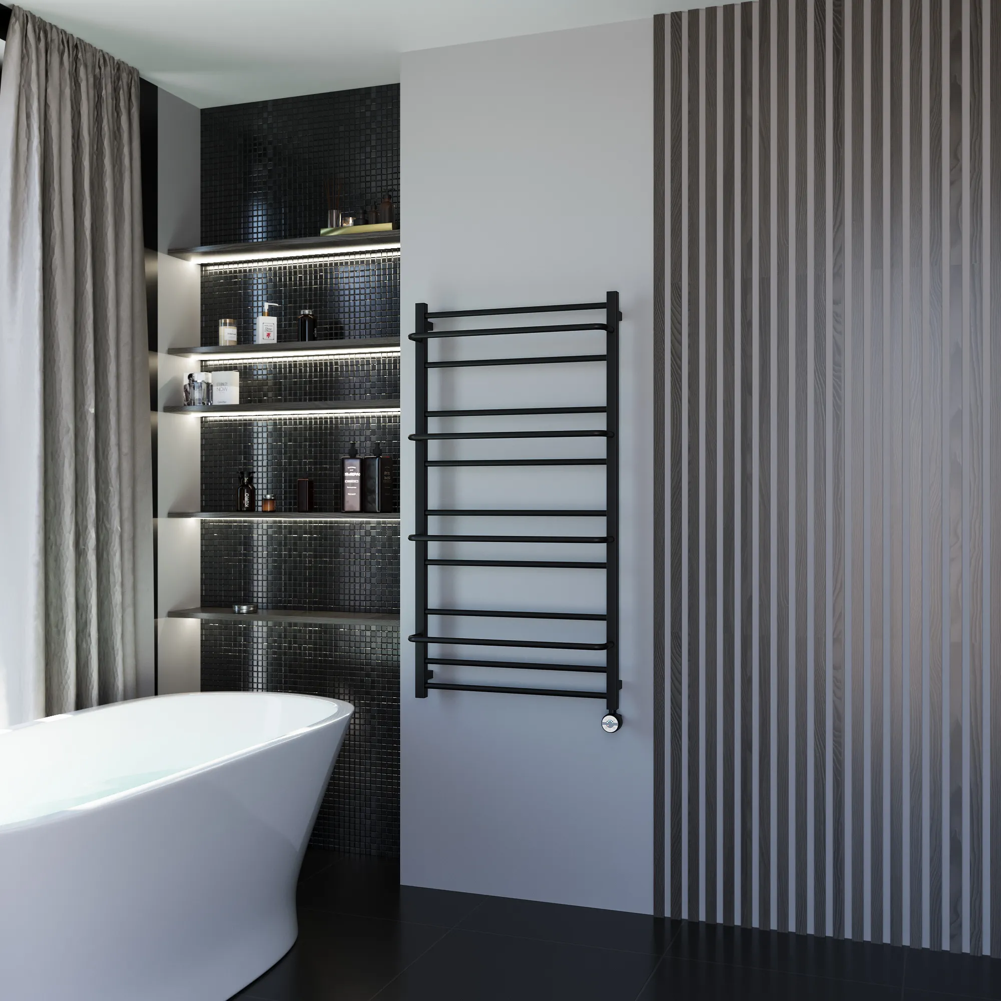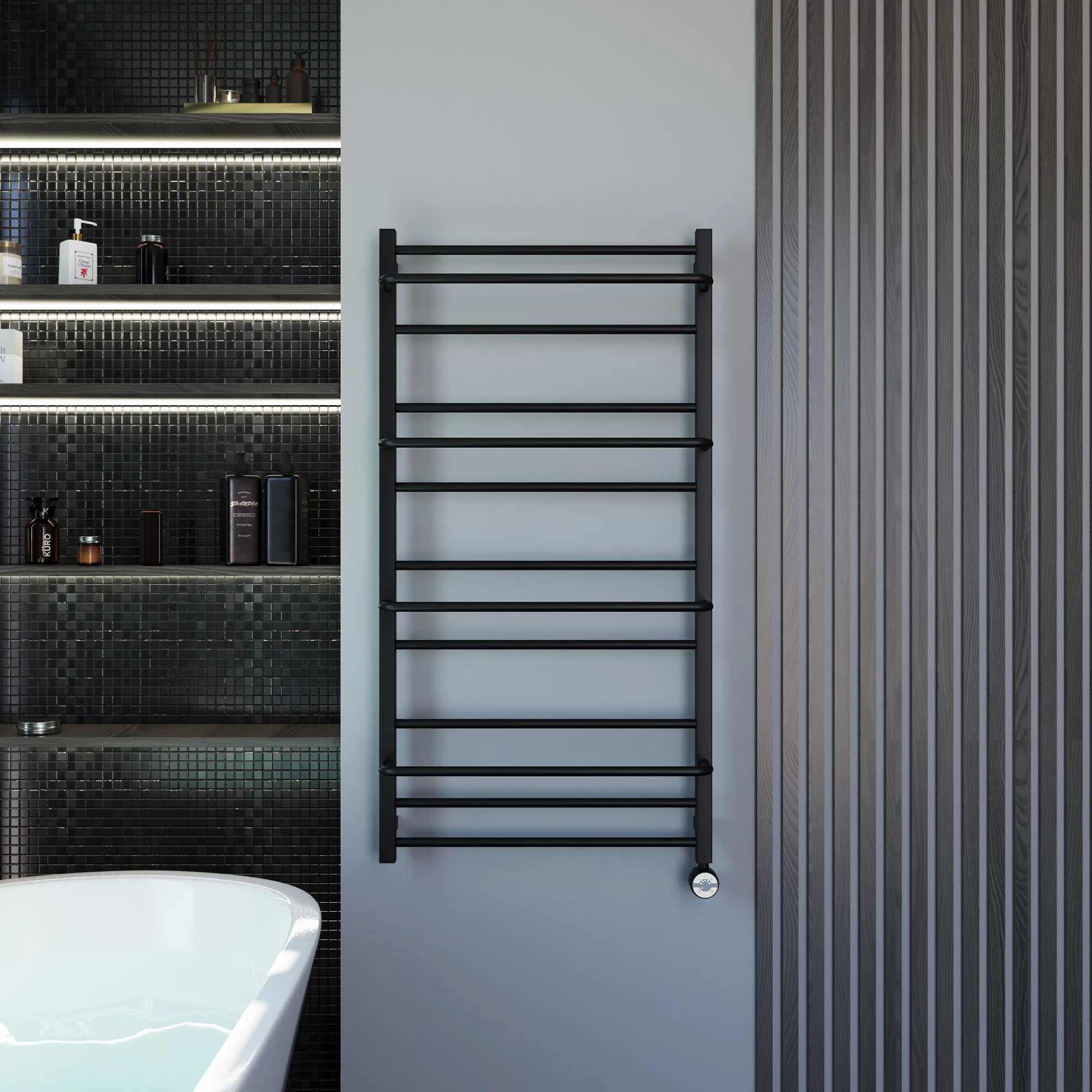 Универсальное подключение к сети дают возможность подключения полотенцесушителя и слева и справа. Скрытое подключение обеспечивает эстетичный внешний вид при котором нет видимых проводов. В комплекте так же есть кабель-вилка длиной 100 см для обычного подключения через розетку.
