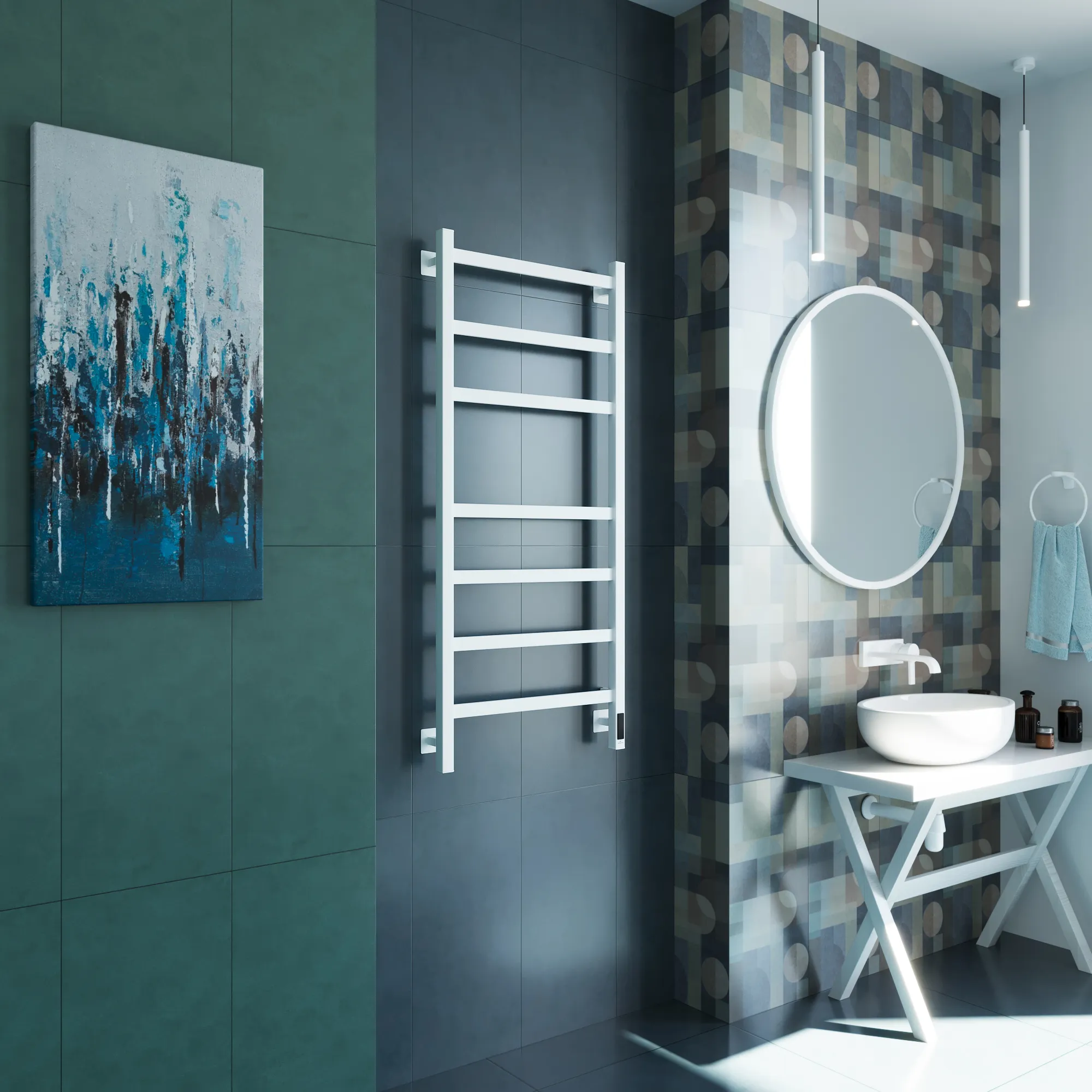 Универсальное подключение к сети дают возможность подключения полотенцесушителя и слева и справа. Скрытое подключение обеспечивает эстетичный внешний вид при котором нет видимых проводов. В комплекте так же есть кабель-вилка длиной 100 см для обычного подключения через розетку.