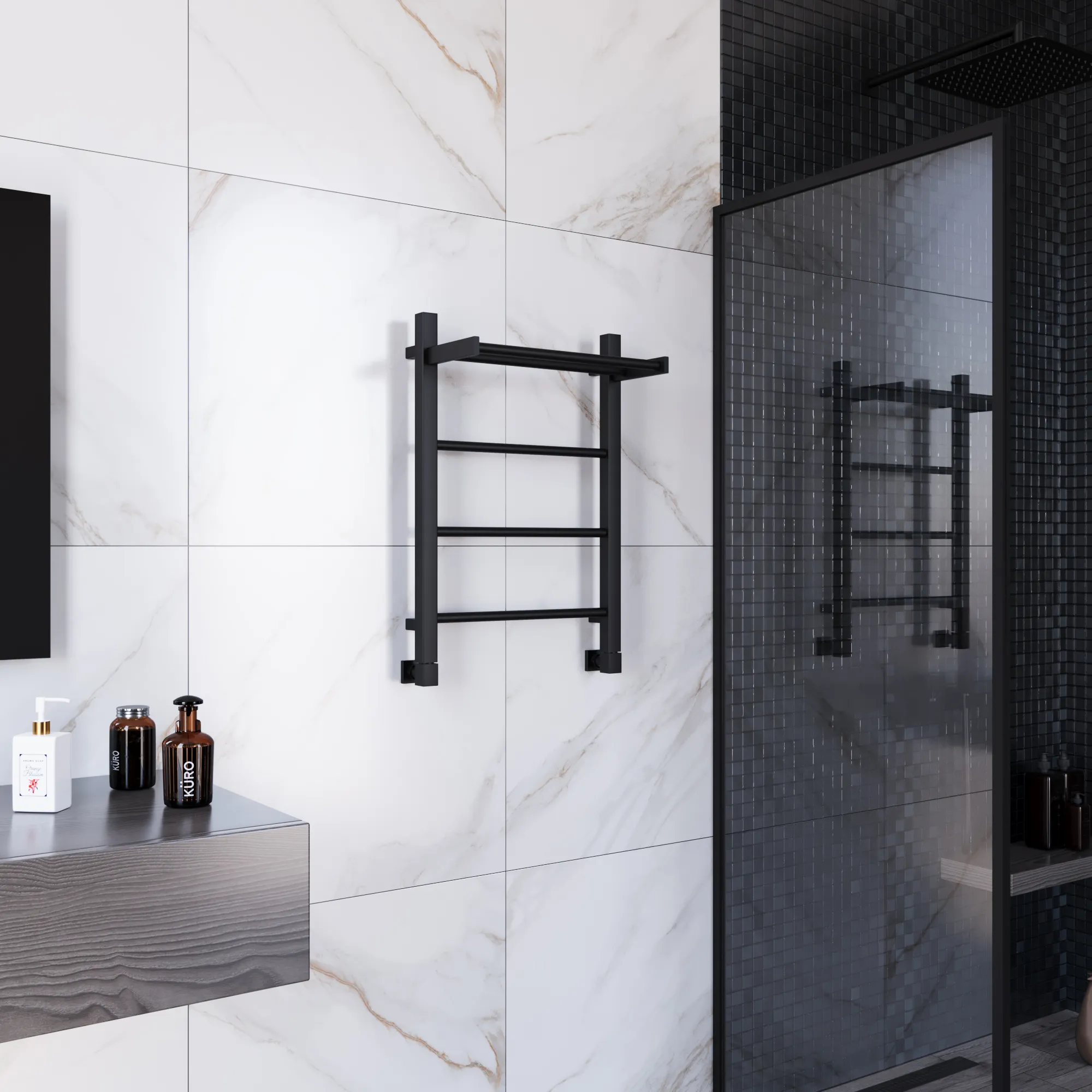 полотенцесушитель, перчатки, комплект дюбелей, винтов, шайб, болтов с шестигранной головкой, шестигранный ключ, кран Маевского, инструкция по монтажу