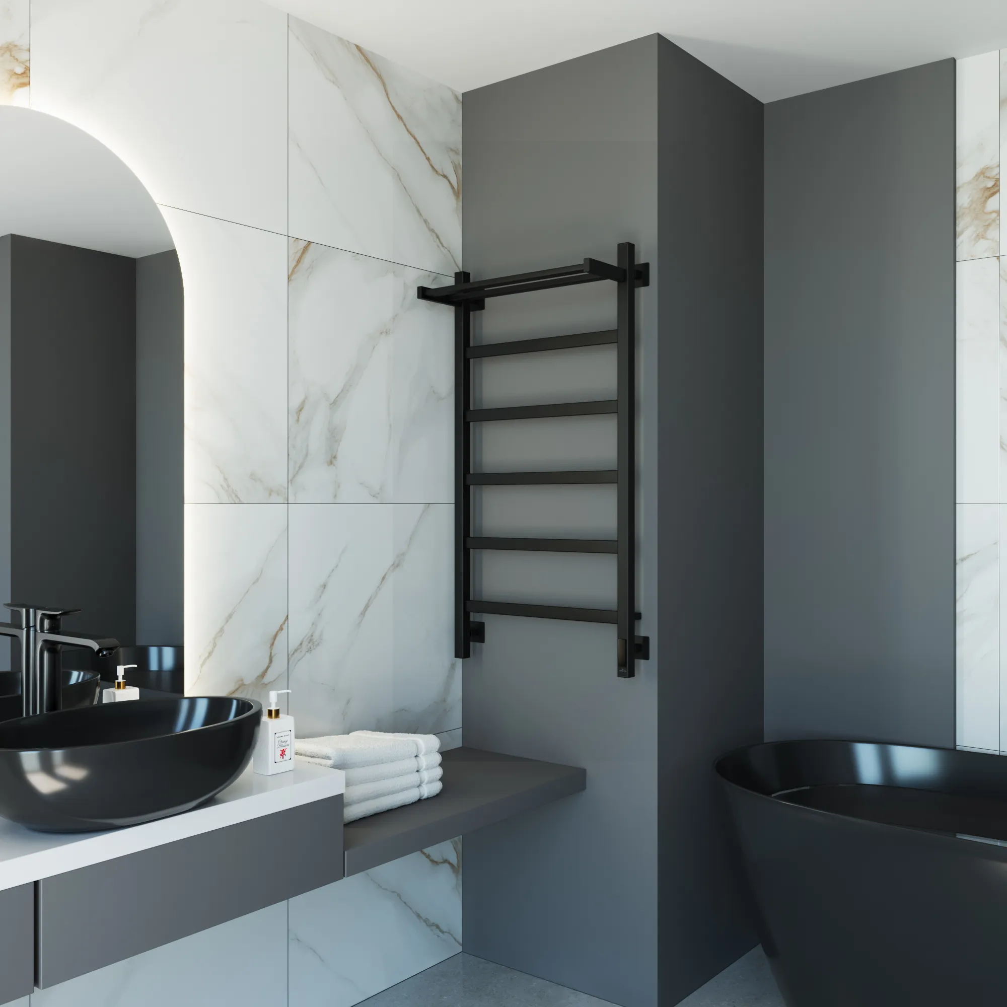 полотенцесушитель, перчатки, комплект дюбелей, винтов, шайб, болтов с шестигранной головкой, шестигранный ключ, кран Маевского, инструкция по монтажу